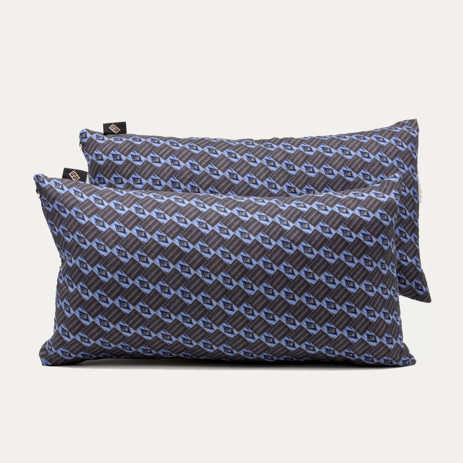Cuscini in seta blu con stampa geometrica, di forma rettangolare.